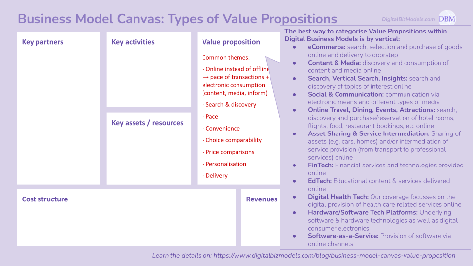 Typical types of value proposition within digital business models shown in the biz model canvas